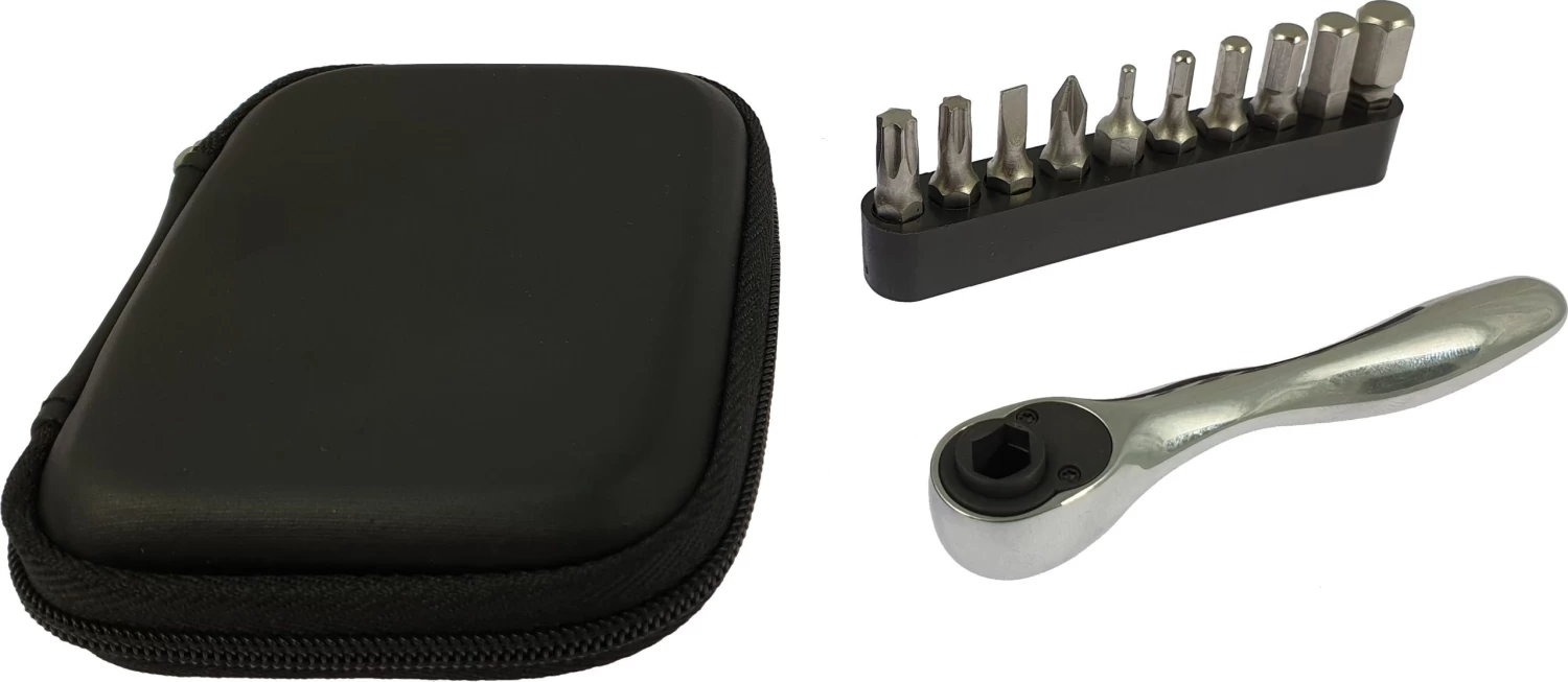 Contient une mini clé à cliquet avec embouts :